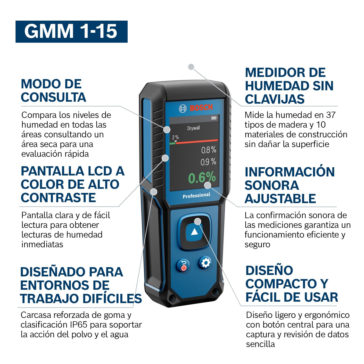 - RÁPIDO Y PRECISO: Mide la humedad en 37 tipos de madera y 10 materiales de construcción con pantalla LCD de alto contraste