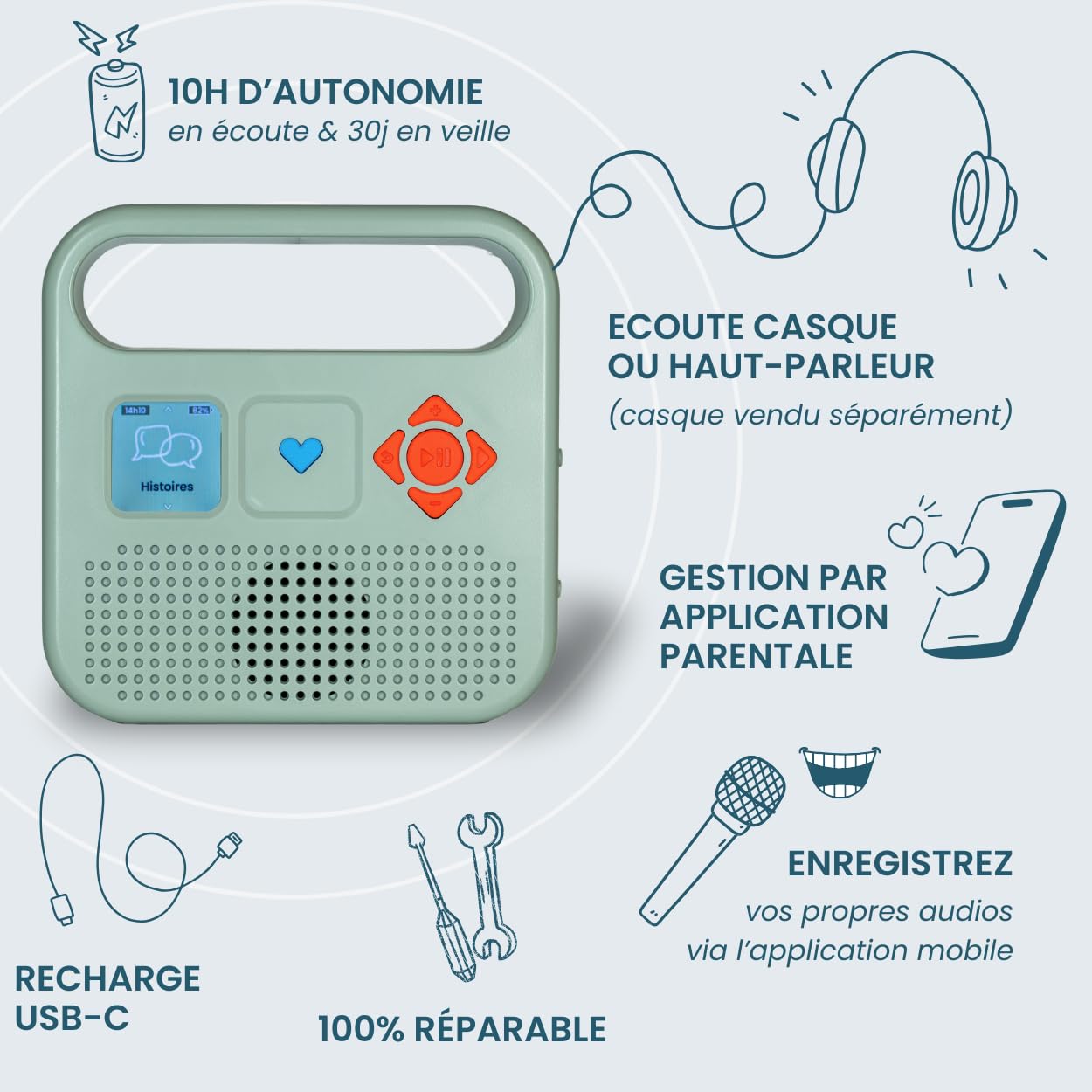 - ÉTICO, DURABLE Y RESPONSABLE: Un altavoz especialmente diseñado para niños (escucha sin conexión; sólido, pequeño y ligero; sin recopilación de datos). Fabricación francesa y responsable, para un producto duradero en el tiempo y REPARABLE con nuestro SAV.