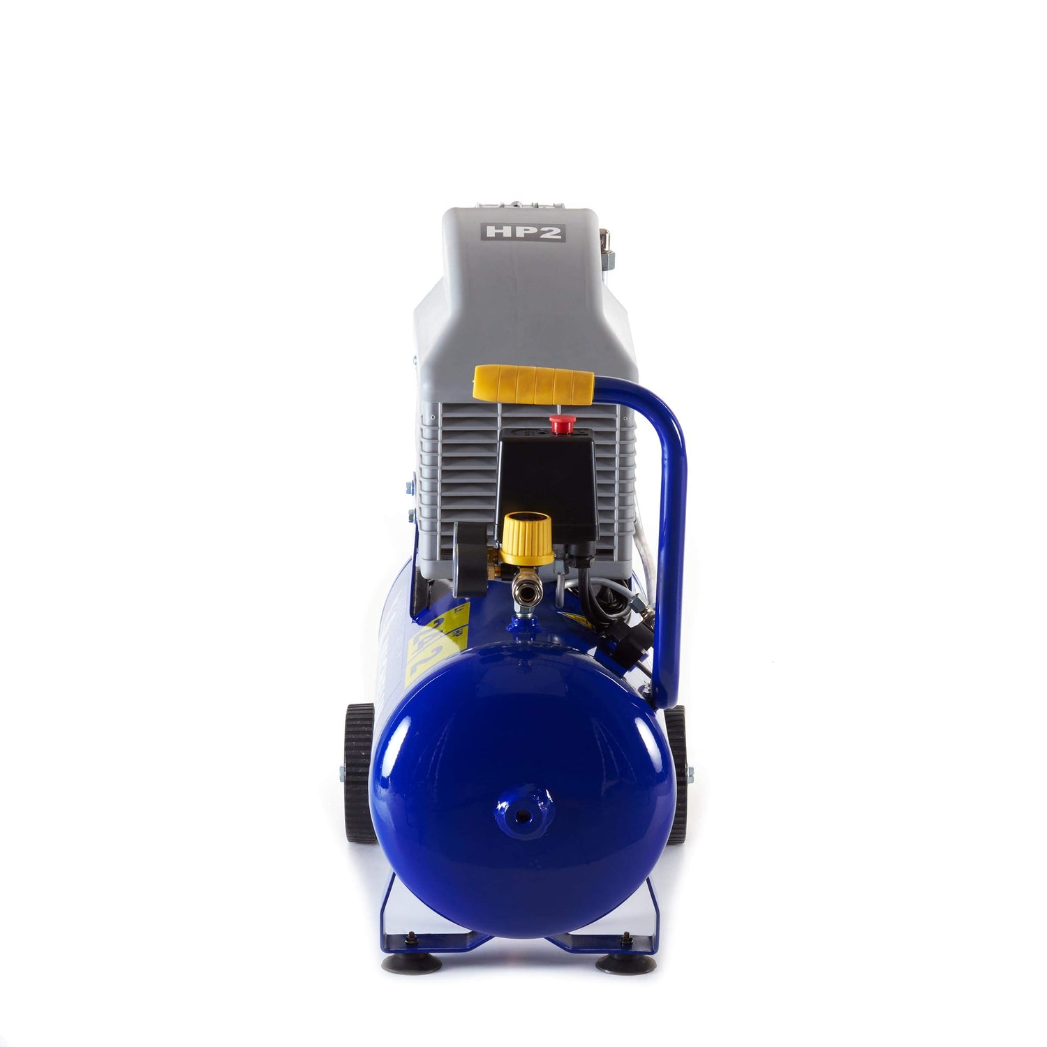 - Capacidad del depósito: 24 litros, Motor: 2 hp, Presión máxima: 8 bar, Flujo de aire de admisión: 170 l/min - 10,2 m³/h Nivel de ruido: 72 dB(A) LpA 4m - 95 dB(A) LwA, Peso: 27 kg, Alimentación 230 V