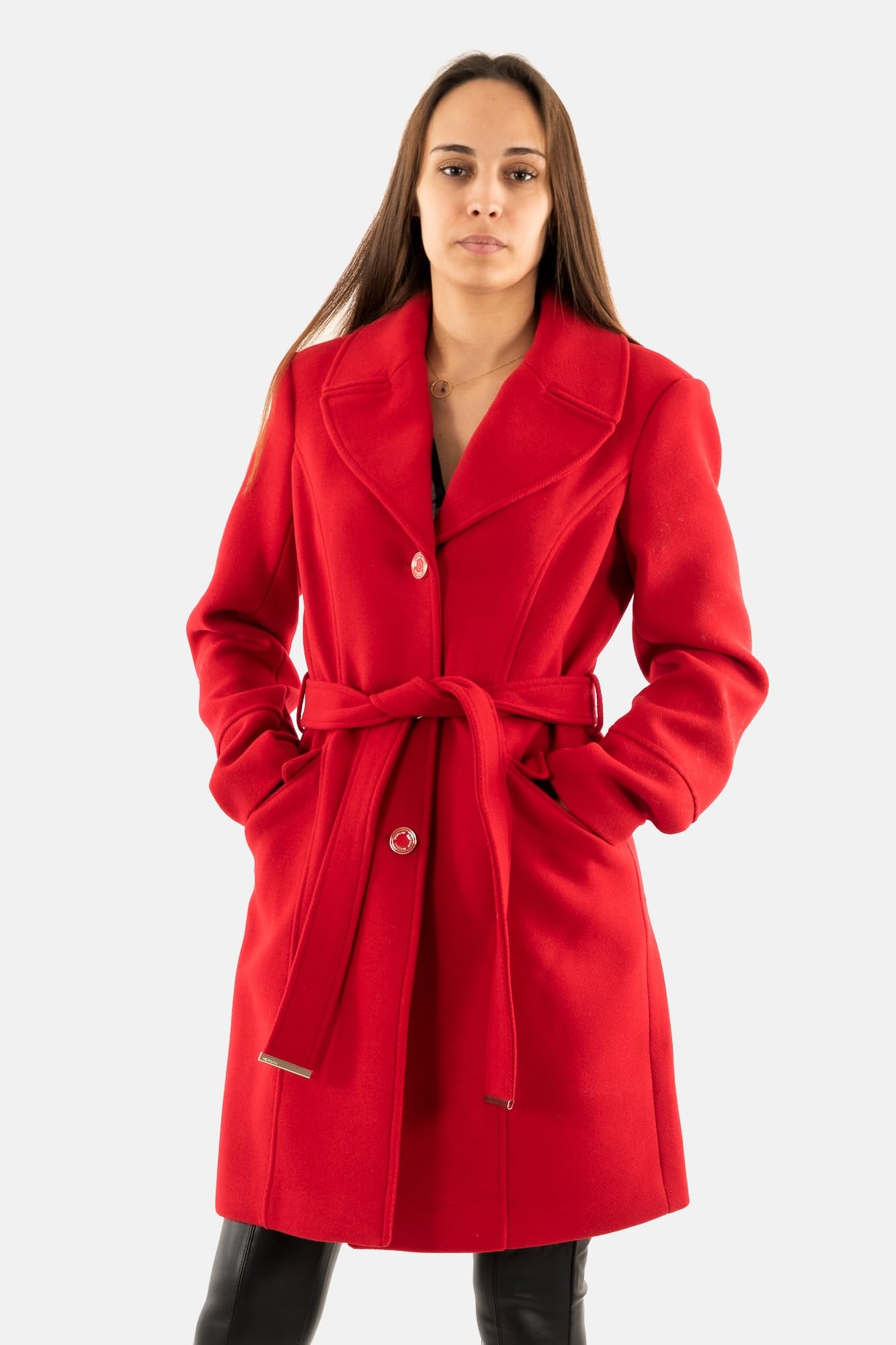 Abrigo largo con cinturón Morgan rojo con lana, un solo botón, bolsillos delanteros con solapa