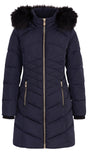 Morgan mujer chaqueta larga Marina, piel sintética con capucha, 2 bolsillos con cremallera, cremallera lateral, detalle de piel sintética en las mangas