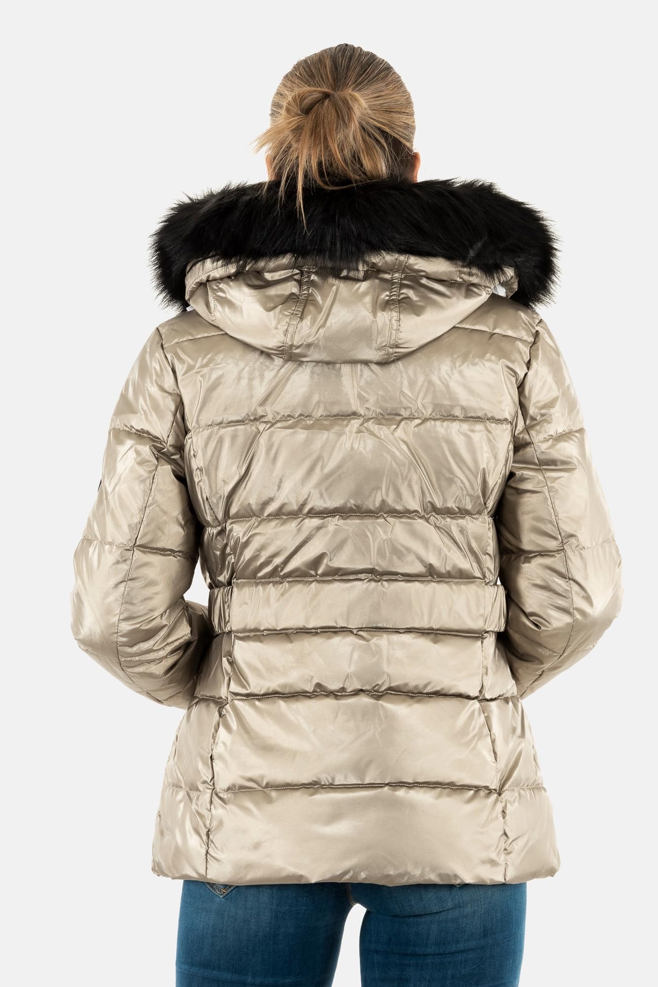 Chaqueta de plumas con capucha metalizada mordida, piel sintética con capucha, 2 bolsillos a presión