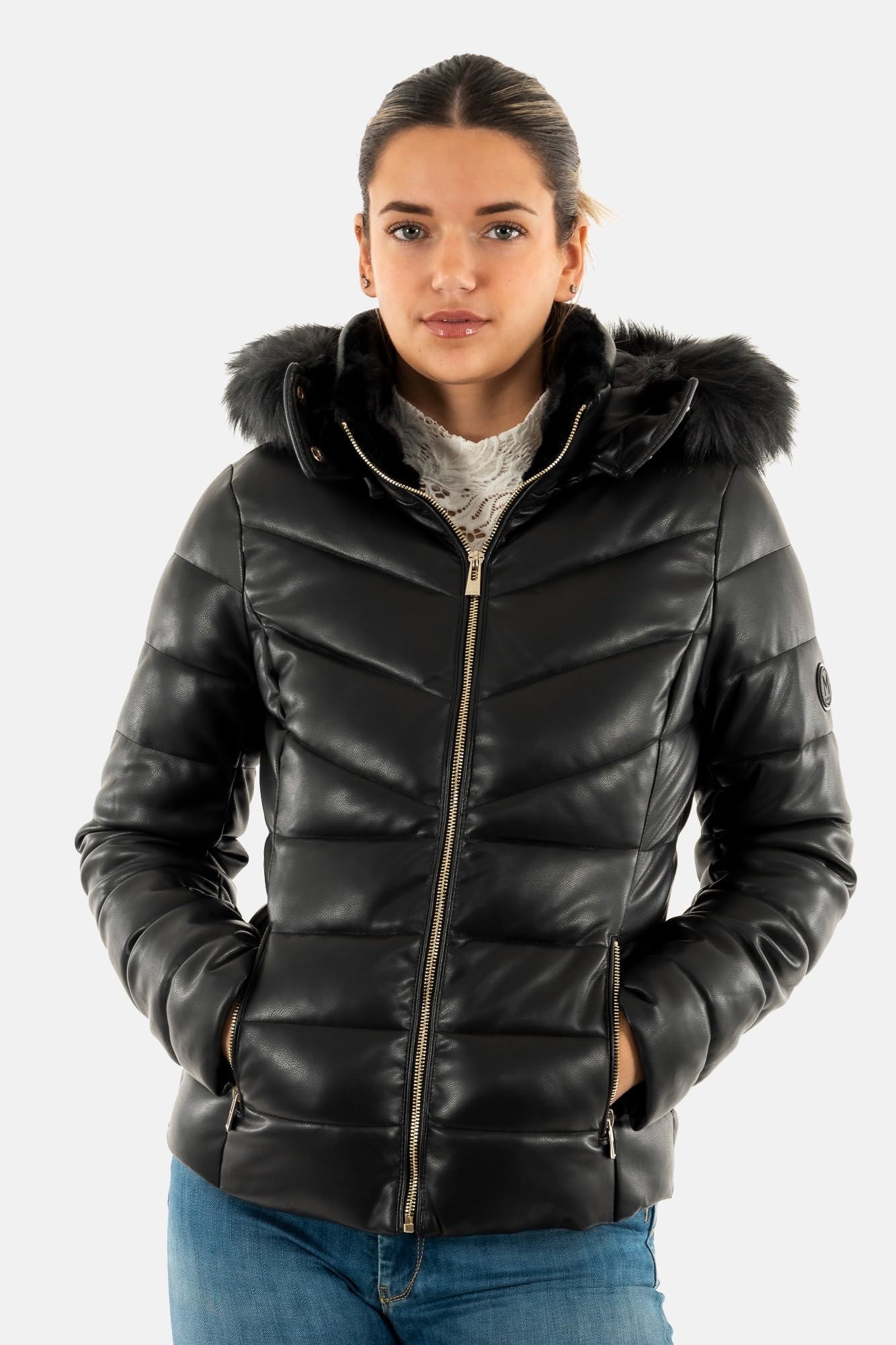 Chaqueta corta de chocolate, capucha extraíble de piel sintética, 2 bolsillos con cremallera, cintura ajustada por un elástico en la espalda