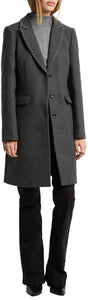 Abrigo largo abotonado, cuello con solapa, dos bolsillos en la parte delantera, detalle de blous en el cuello