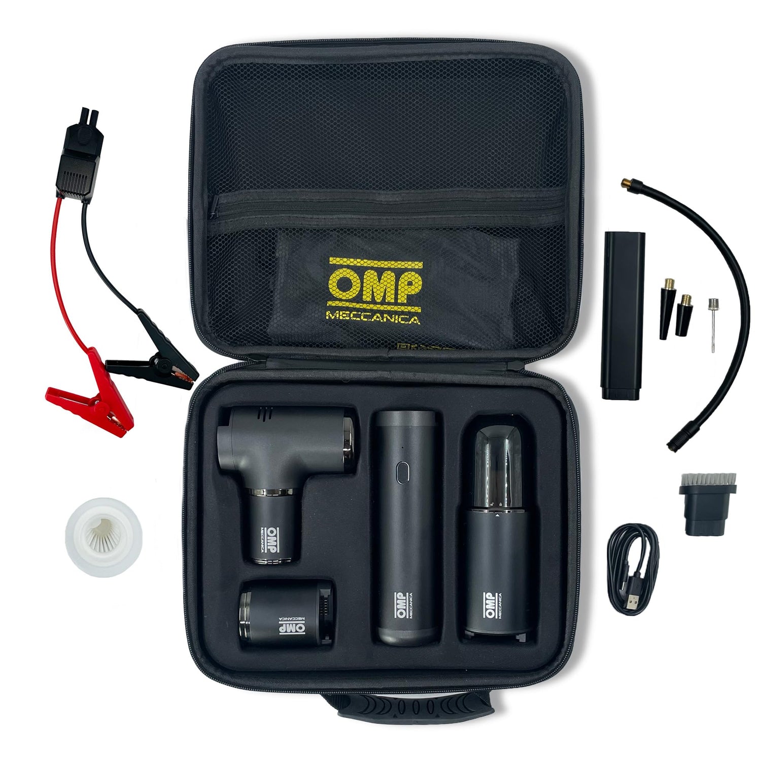 OMP Meccanica 5 EN 1 Kit Portátil Multi-Función Sin Cable – Arrancador de coche, Compresor de Aire, Aspiradora, Linterna y Power Bank – Compacto y Esencial para Asistencia en Carretera con Estuche