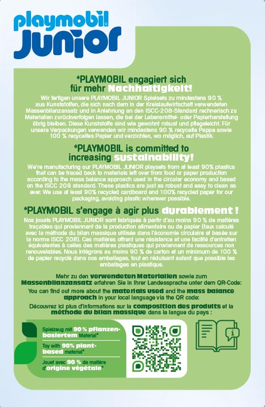 • Sostenibilidad: PLAYMOBIL JUNIOR está fabricado con más del 90% de plásticos de base vegetal. Para nuestros envases, utilizamos al menos un 90% de cartón reciclado y un 100% de papel reciclado, y evitamos en la medida de lo posible el plástico*