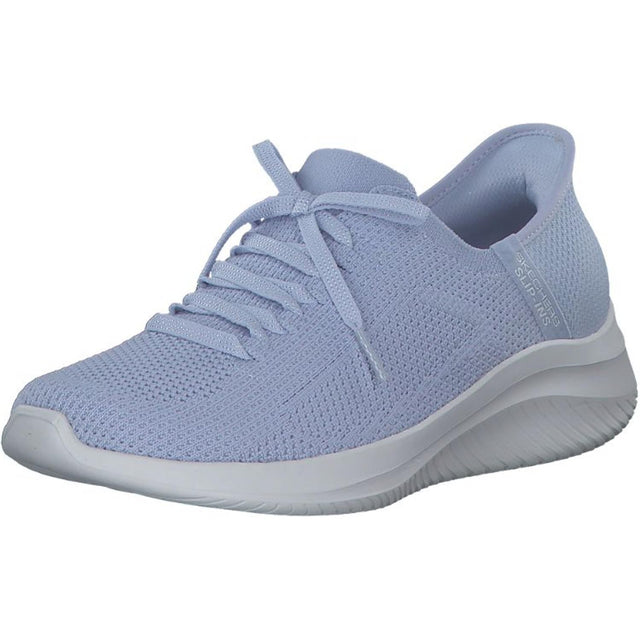 Ajuste sin contacto: entra en la comodidad sin esfuerzo con los zapatos sin cordones Skechers Manos Libres: Ultra Flex 3.0 - Camino brillante. Diseñado con nuestra exclusiva almohada para el talón. Este estilo cuenta con una parte superior de punto diseñada con ajuste elástico con cordones decorativos, además de una plantilla acolchada de espuma viscoelástica Skechers refrigerada por aire.