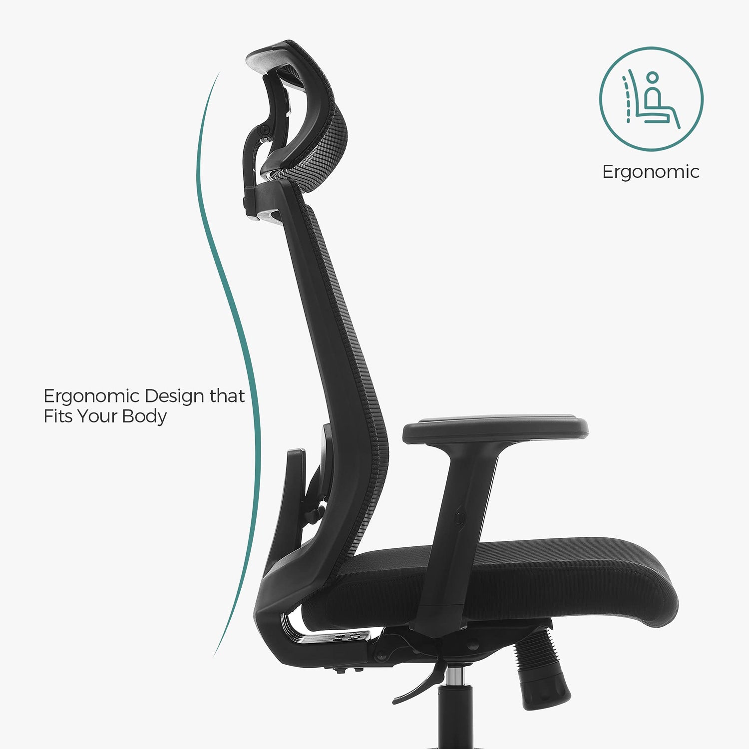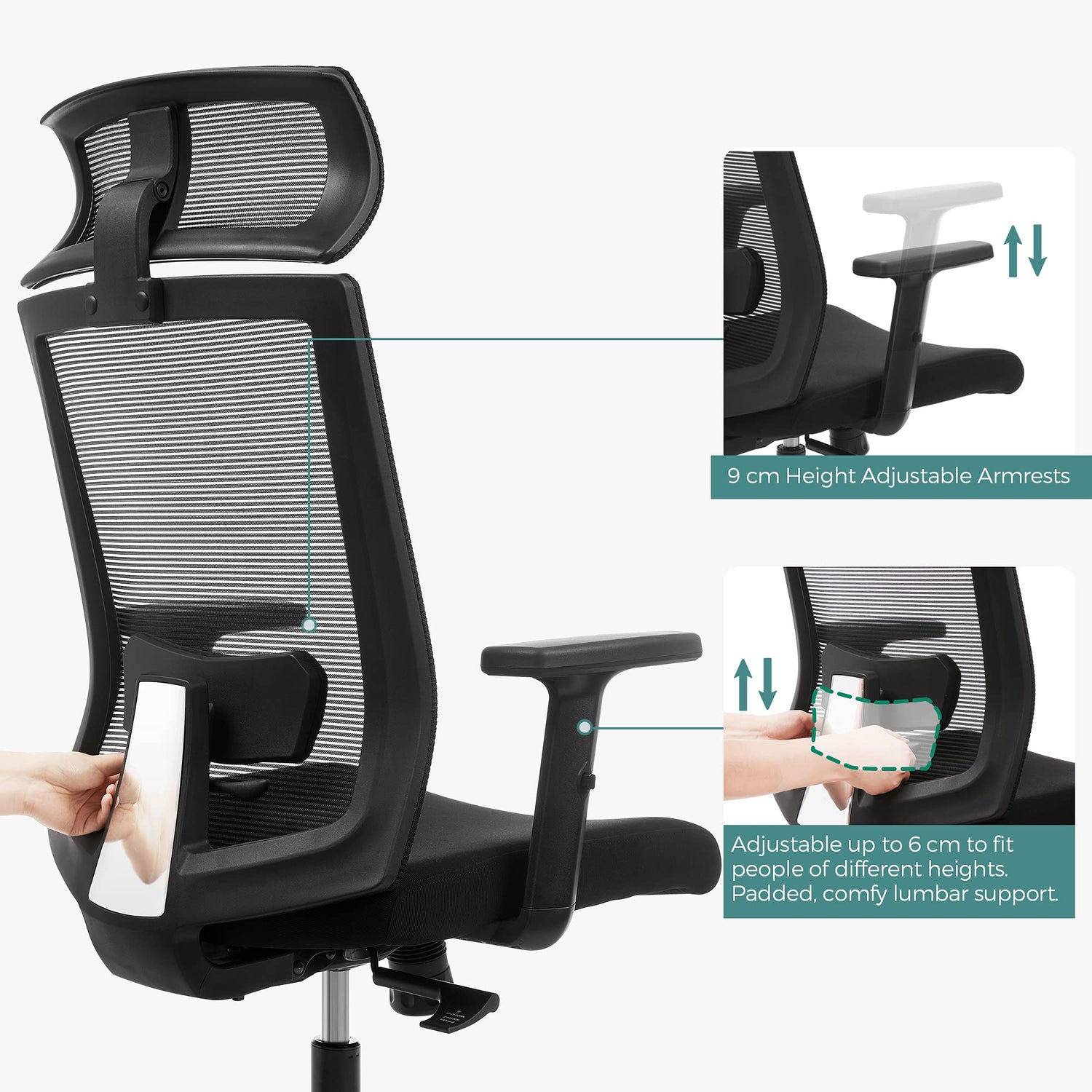 SONGMICS Silla de Oficina de Malla, Silla de Escritorio, Giratorio de 360°, Soporte Lumbar Ajustable, Apoyacabezas y Apoyabrazos, Inclinación del Respaldo hasta 120°, Negro OBN55BK