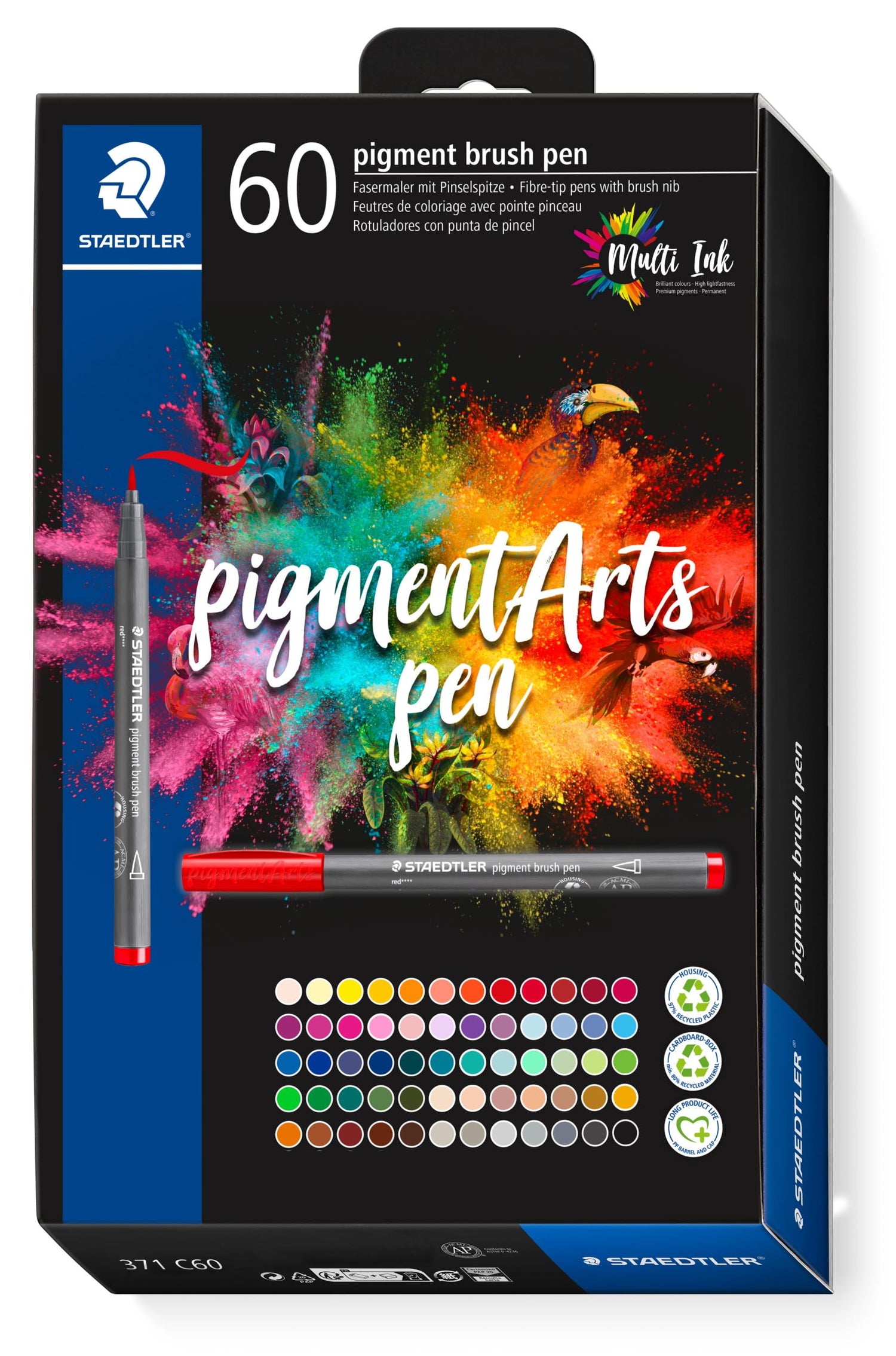 STAEDTLER Brush pen pigment Arts, tinta de dibujo premium, punta de pincel para ancho de línea variable, impermeable, secado rápido, 60 rotuladores en colores surtidos en estuche de cartón, 371 C60