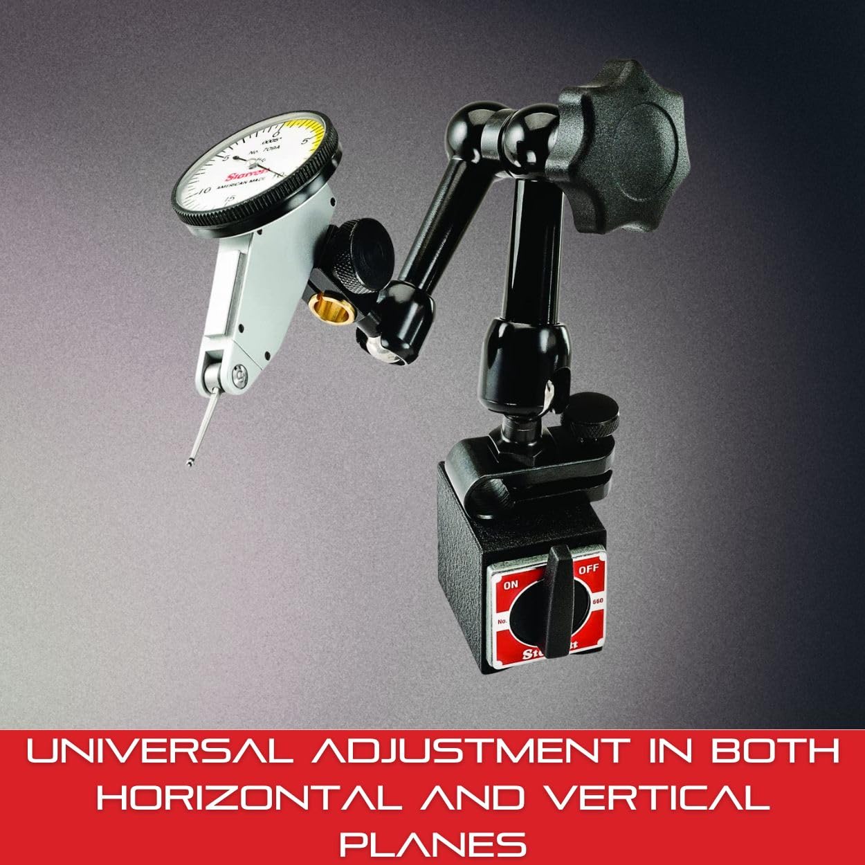 - Puede sostener cualquier indicador con un tallo de 3/8 pulgadas o soporte estándar de cola de milano.