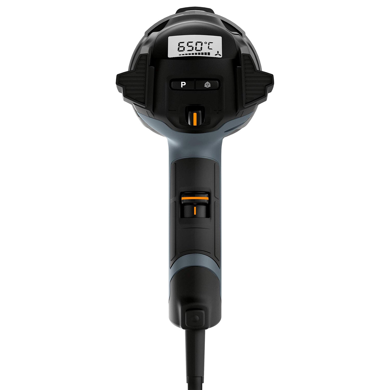 - Pistola de aire caliente profesional con ajuste de temperatura en incrementos de 10°C mediante joystick hasta 700°C y 50° ajuste frío y ventilador ajustable de 2 etapas con 150-500 l/min