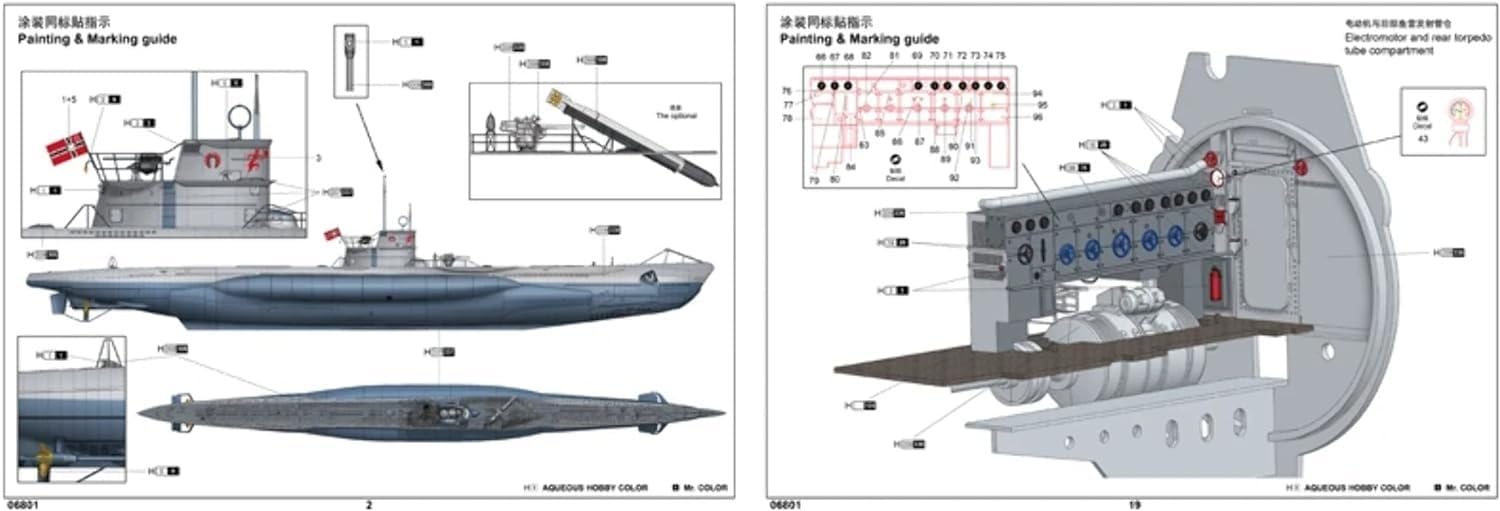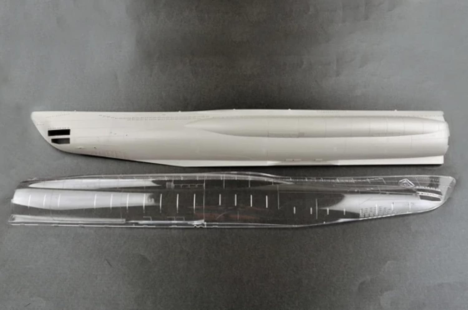 Maqueta de plástico de un submarino alemán WWII con 1100 piezas, piezas fotograbadas y decoración interior. Longitud construida 1398,3 mm / diámetro 136,9 mm.