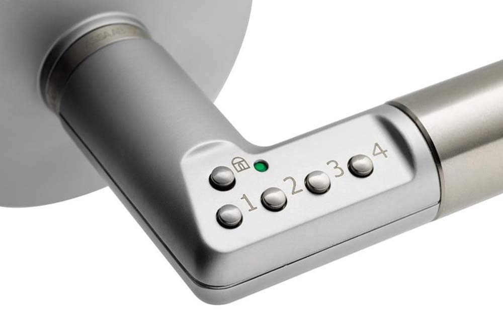 - El mecanismo de bloqueo se opera mediante cinco botones, el mango detiene un código incorrecto durante tres minutos en caso de campo de entrada involuntario